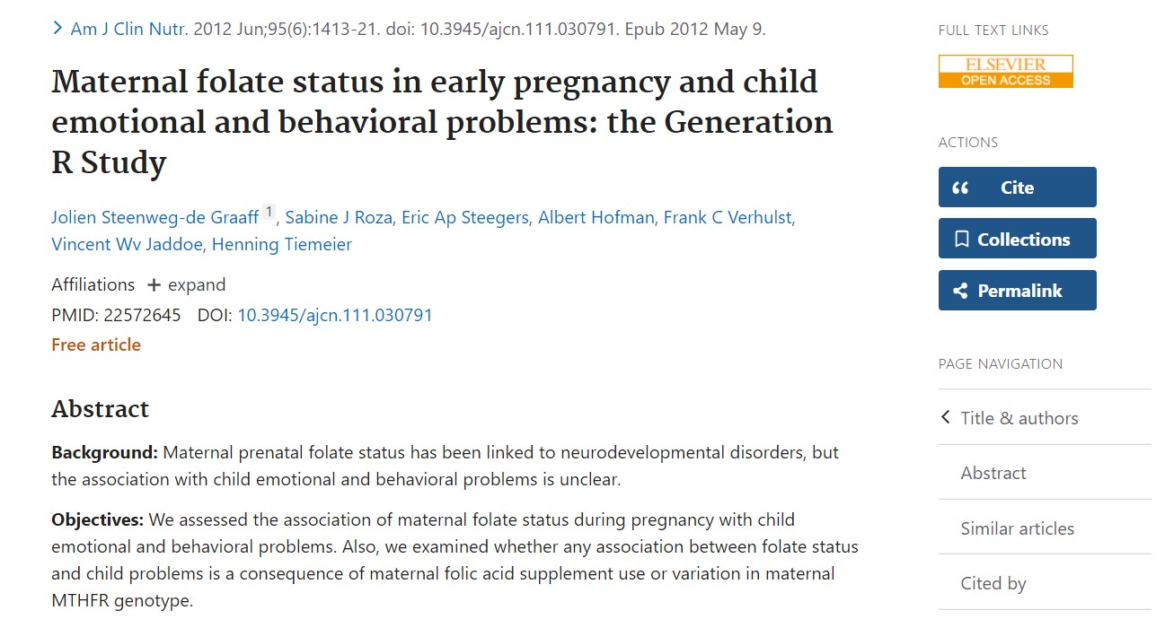 R Kuşağı kohort çalışması olarak bilinen bu çalışma, yetkili kategorisinde yayınlandıAmerikan Klinik Beslenme Dergisi, vurgulanan bir folat ile çocukların duygusal gelişimi arasındaki ilişki nöral tüp defektlerinin önlenmesindeki iyi bilinen rolü.