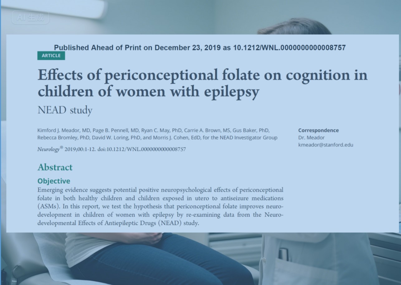 ABD Ulusal Sağlık Enstitüleri tarafından desteklenen, NEAD çalışması 25 epilepsi hastası anne ve çocuktan oluşan benzersiz bir grubu takip etti 1999'dan 2004'e kadar Amerika Birleşik Devletleri ve Birleşik Krallık'taki merkezler. Katılımcı anneler tek bir nöbet önleyici ilaç alıyordu ve bebekler doğumda devam eden gözlem için kaydedildi.