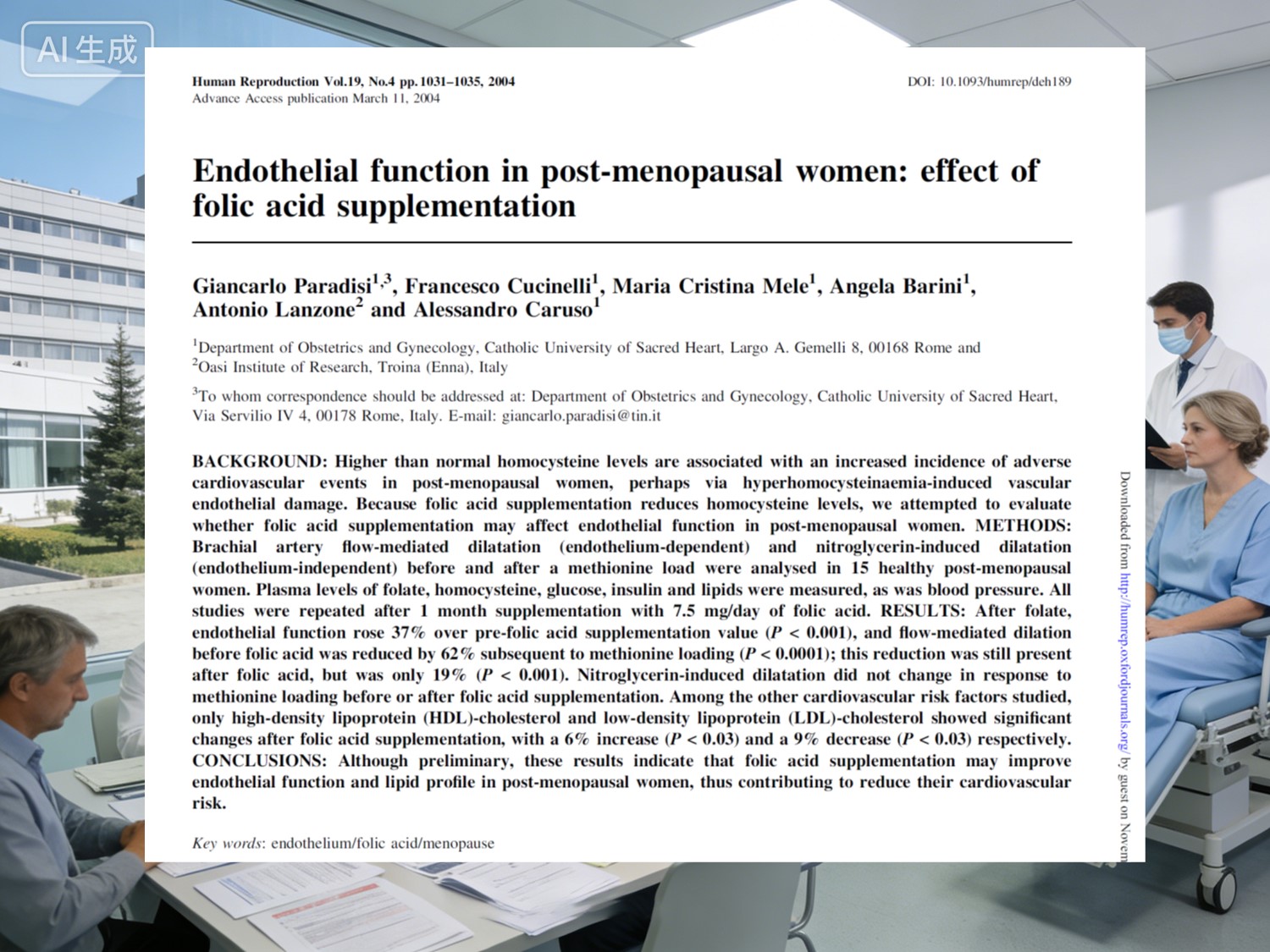 bir 2004'te yayınlanan dönüm noktası niteliğindeki çalışma İnsan Üreme (IF 6.1) tarafından Giancarlo Paradisi, Francesco Cucinelli ve meslektaşları özellikle menopoz sonrası kadınlar. Tipik durumu temsil eden on beş sağlıklı katılımcı menopoz sonrası durum, 7,5 aldı mg/gün Bir ay boyunca folik asit. Sonuçlar belirgin iyileşmeler gösterdi: