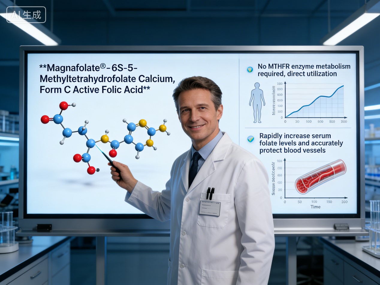 Magnafolat®, bir 6S-5-metiltetrahidrofolat kalsiyum (Kristal Aktif Folat), bunu karşılar temel klinik ihtiyaç. Doğal olarak aktif bir folat olduğundan, MTHFR enzimi yok metabolizma ve anında kullanıma hazır olarak vücuda girer, Bunu temizlemek için hızla HCY arıza yoluna katılıyoruz“sessiz aşındırıcı”gemilerin. Serum folatını hızla yükseltir zamanında, hedefe yönelik damar korumasını mümkün kılan mükemmel düzeyde uyum sağlar. menopoz sonrası enzimatik değişiklikler, böylece ortadan kaldırılır“takviye edin ancak absorbe etmeyin”sorun.